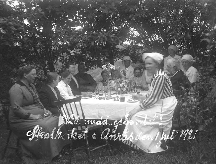 Skrivet på bilden: "Vid middagsbordet! Skolköket i Anrås. 1 juli 1921."