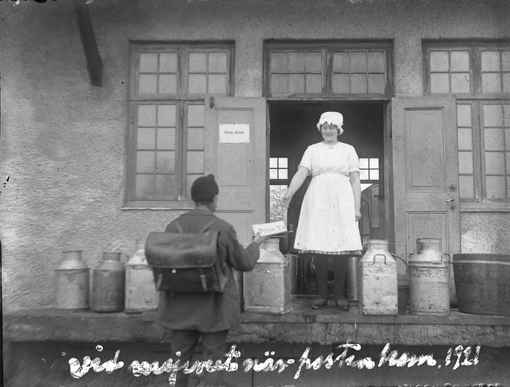 Enligt text skriven på glasplåten: "Vid mejeriet när posten kom. 1921."