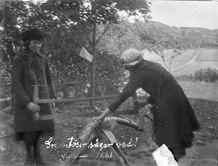 Enligt notering: "Lisa och Svea i Karlslund sågar ved".
