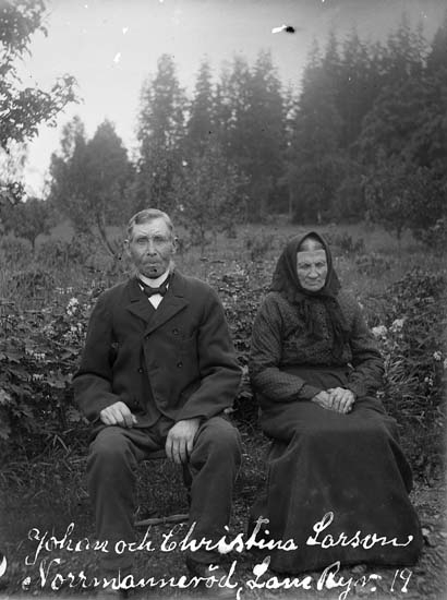 Enligt text skriven på glasplåten: "Johan och Christina Larsson Nordmanneröd, Lane Ryr 1919".