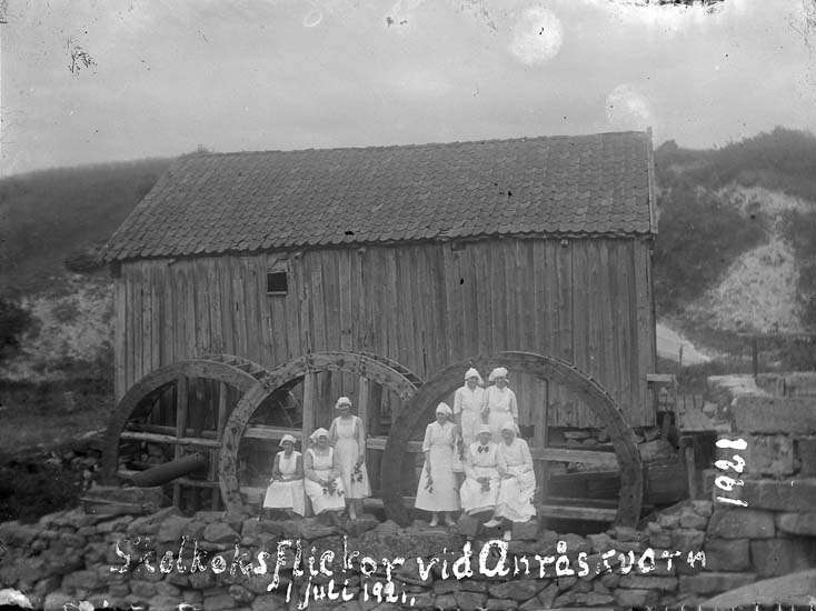 "Skolköksflickor vid Anrås kvarn. 1 juli 1921."