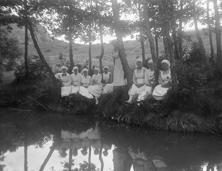 Enligt notering: "Skolkökselever vid en damm".