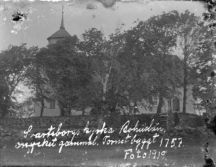 Enligt text på fotot: "Svarteborgs kyrka Bohuslän. mycket gammal. Tornet byggt 1757. Foto 1919".