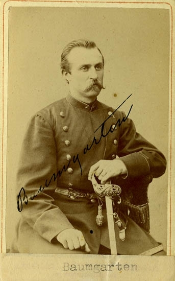 Text på kortets baksida: "Thure Reinhold Leonard von Baumgarten. Kapten. Gymnastiklärare vid läroanstalten i U-a 1884-1909".