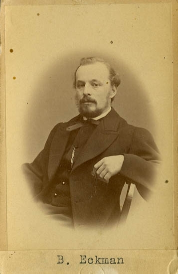 Text på kortets baksida: "Ombudsman B Eckman, född 1839 död 1898".