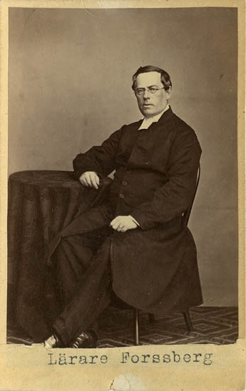 Text på kortets baksida: "Peter Forsberg, f. 1818 d. 1882. Lärare vid Lancasterskolan, Uddevalla. Vid sin död kyrkoherde i Onsala. Vid skolan i U-a 1848 1866".