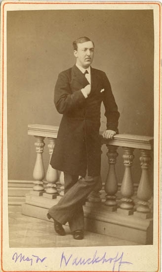 Text på kortets baksida: "Major Henrik Fredrik Adolf Nauckhoff, f. 1858. Skaparen ac "Gottskärs lägret". Major, Överstelöjtnant. Boh. reg".