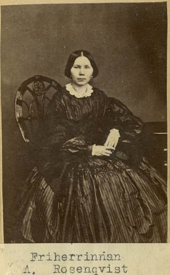 Text på kortets baksida: "Friherrinnan Augusta Maximiliana Euphresine Rosenqvist, f. Åkerhjelm. F. 1822 död 23 jan. 1866, 44 å 4 m 23 d".