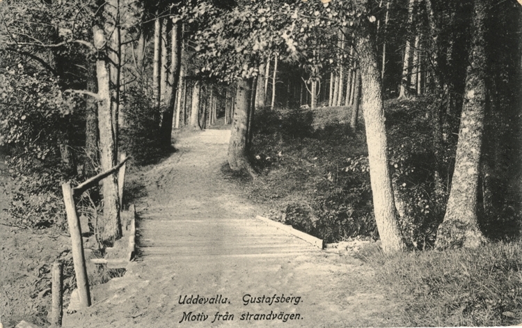 Tryckt text på vykortets framsida: "Uddevalla, Gustafsberg. Motiv från strandvägen."