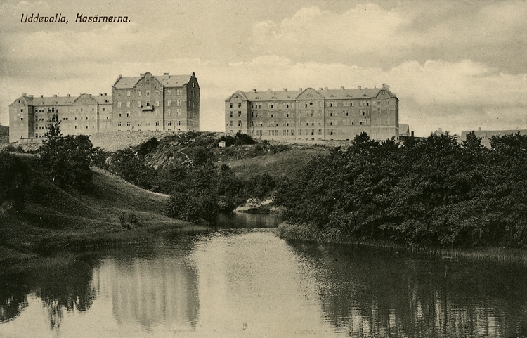 Tryckt text på vykortets framsida: "Uddevalla. Kasärnerna."