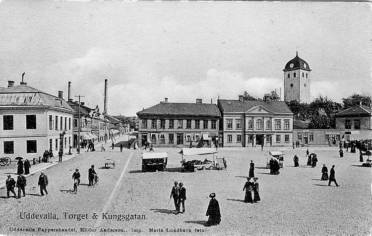 Tryckt text på vykortets framsida: "Uddevalla Torget & Kungsgatan".