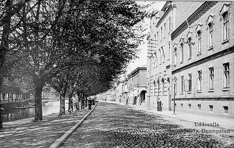 Tryckt text på vykortets framsida: "Uddevalla Hamngatan".