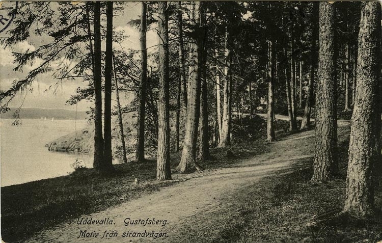 Tryckt text på vykortets framsida: "Uddevalla, Gustafsberg, Motiv från strandvägen."