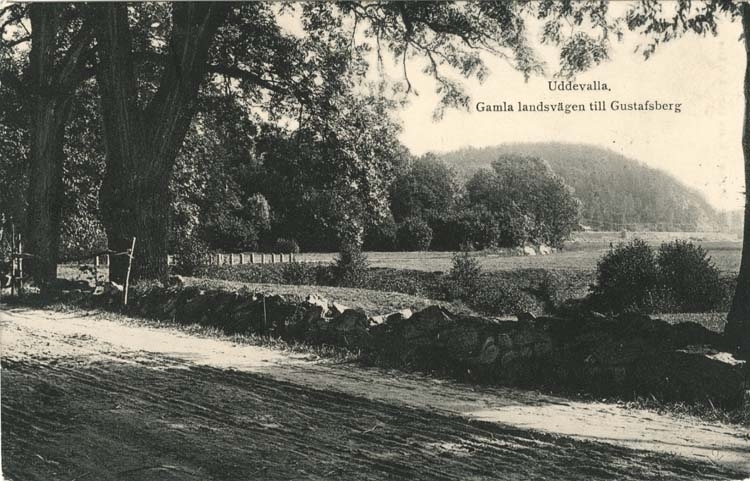 Tryckt text på vykortets framsida: "Uddevalla, Gamla landsvägen till Gustafsberg."