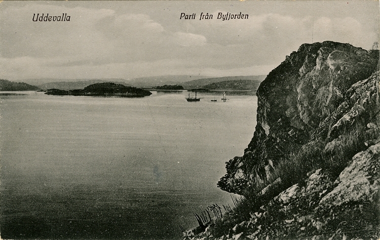 Tryckt text på vykortets framsida: "Uddevalla Parti från Byfjorden."
