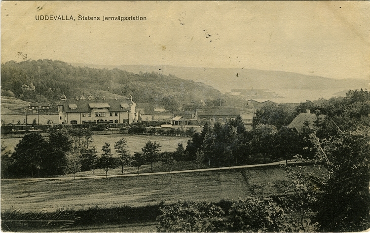 Tryckt text på vykortets framsida: "Uddevalla, Statens järnvägsstation."