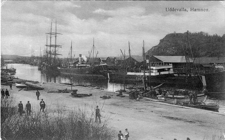Tryckt text på vykortets framsida: "Uddevalla, Hamnen."