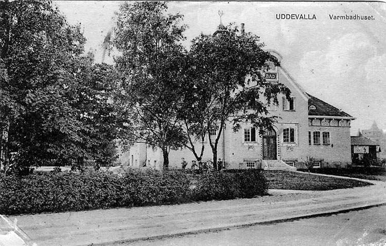Tryckt text på vykortets framsida: "Uddevalla. Varmbadhuset."