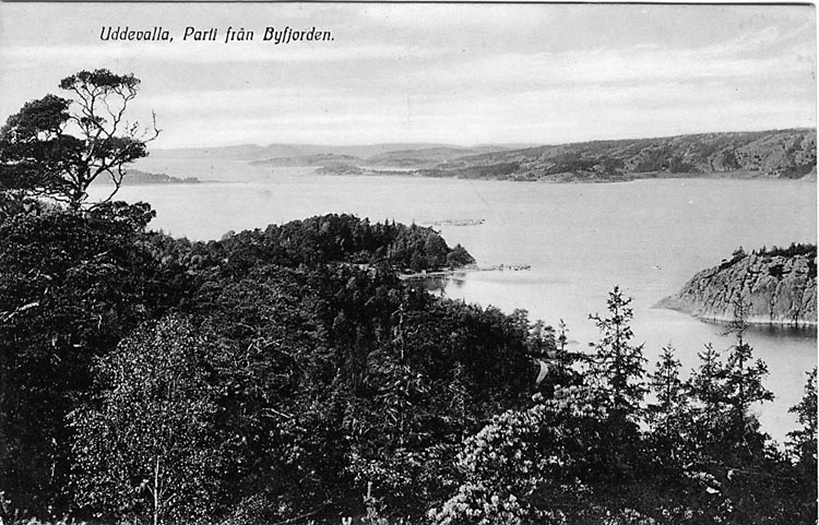 Trykt text på vykortets framsida: "Uddevalla, Parti från Byfjorden."