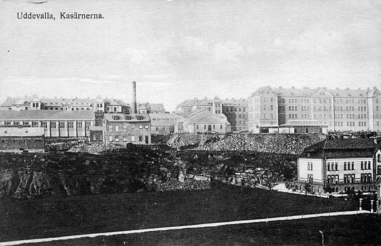 Tryckt text på vykortets framsida: "Uddevalla, Kasärnerna."