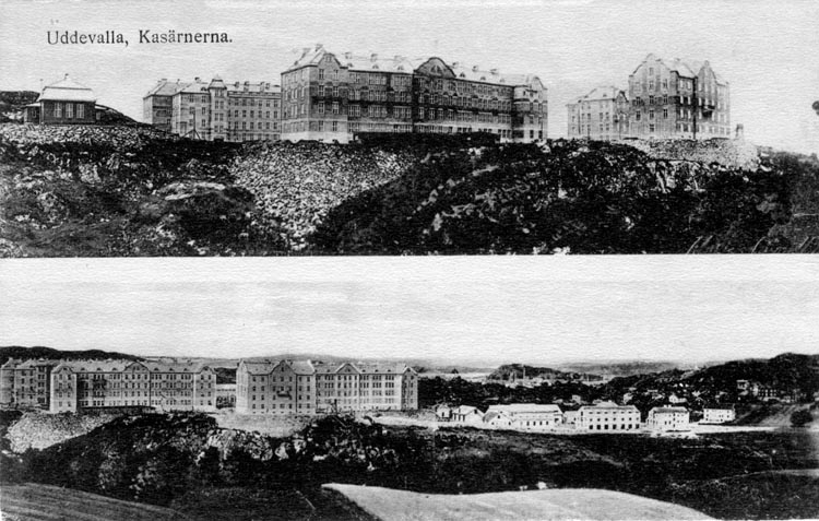 Tryckt text på vykortets framsida: "Uddevalla, Kasärnerna."