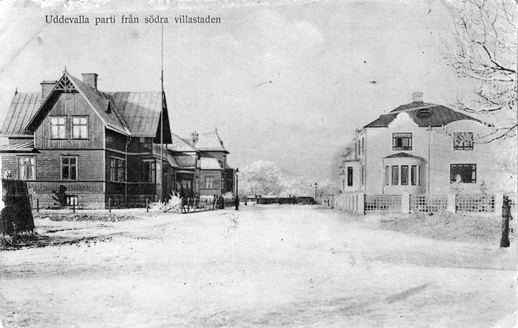 Tryckt text på vykortets framsida: "Uddevalla. Parti från södra villastaden".