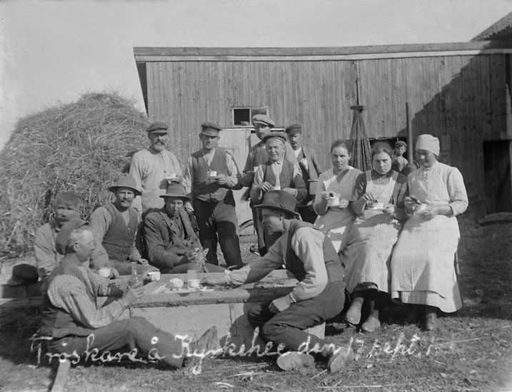 Enligt noteringar: "Tröskare å Kyrkehee, Olle på sittande t v".
