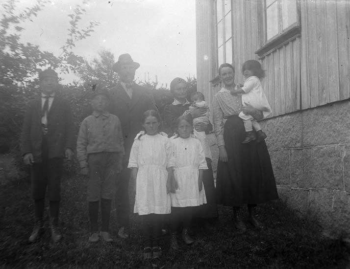 Enligt notering: "En familjebild, vid husknuten, Anton Benjaminsson Veberg med familj".