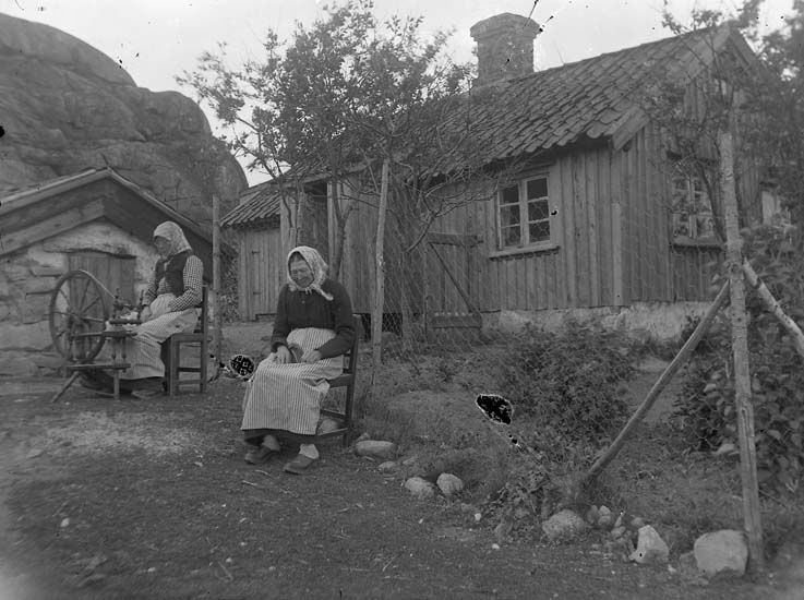 Enligt notering: "Två äldre, men spinnrocken. Utomhus, Kransetöserna, Brattbergstorpet?"