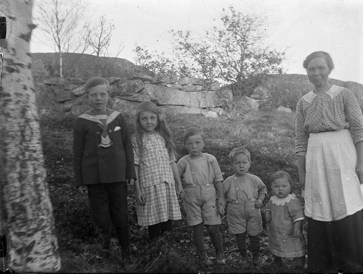 Enligt notering: "5 barn + moder. Helge, Astrid, Allan, Albert, Gerda och modern Helga Johansson i Råröd, ....?".