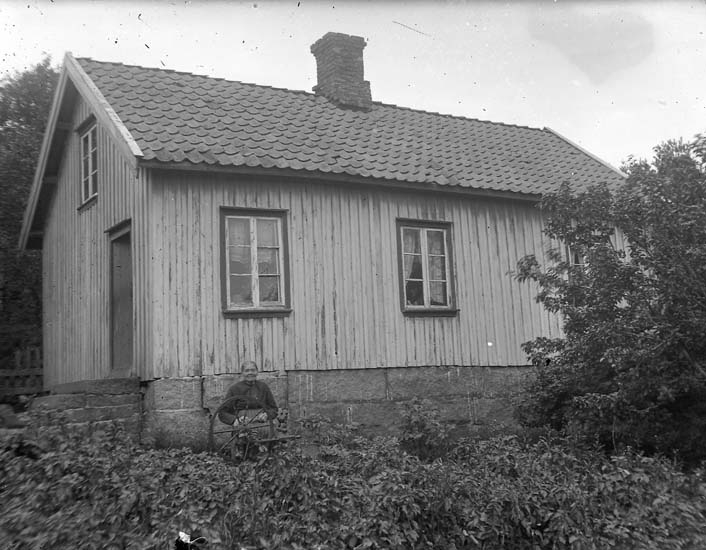 Enligt notering: "Kvinna med spinnrock framför huset".