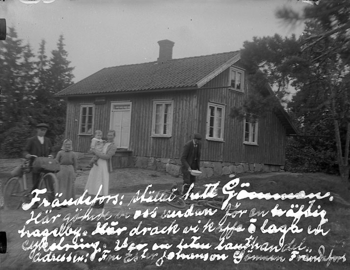 Enligt text på fotot: "Frändefors: stället hette Gömman. Här gömde vi oss undan för en häftig hagelby. Här drack vi kaffe å laga en cykelring. Var en liten lanthandel adressen: Fru Ester Johansson Gömman Frändefors".