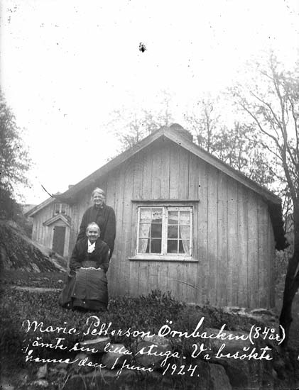Skrivet på bilden: "Maria Pettersson Örnbacken (84 år) jämte sin lilla stuga. Vi besökte henne den 1 juni 1924."