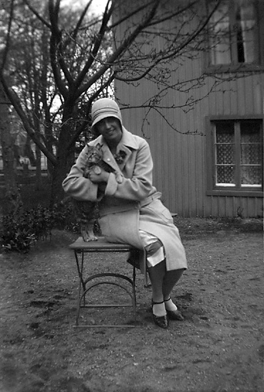 Maj Berggren sitter på en trädgårdsstol med en katt i famnen