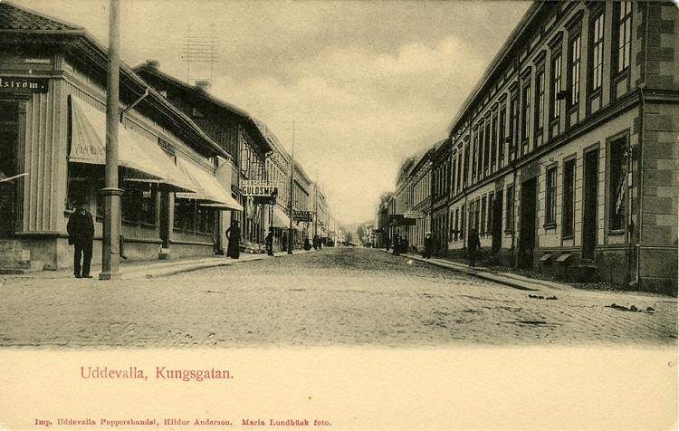 Tryckt text på vykortets framsida: "Uddevalla, Kungsgatan."