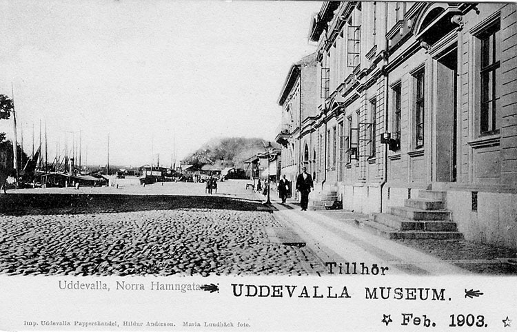 Tryckt text på vykortets framsida: "Uddevalla Norra Hamngatan".
