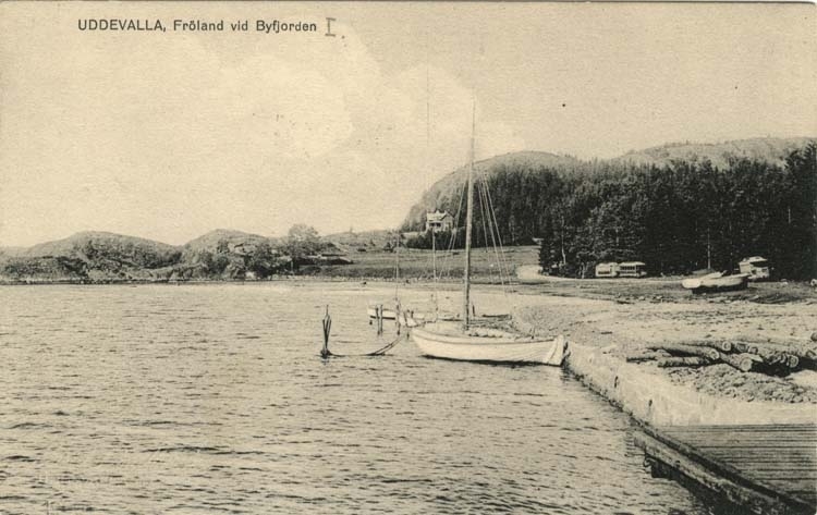 Tryckt text på vykortets framsida: "Uddevalla, Fröland vid Byfjorden."