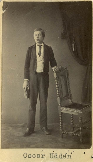 Text på kortets baksida: "Oscar Uddén. (Hos Öller). Fadern Garfvaren Olsson bodde i Blomsterwalla hus".