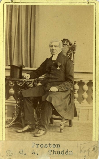 Text på kortets baksida: "Prosten Carl Adolf Thudén, f. i U-a 1793 27/7. Köpmanson. Student i Upsala 1812 prestvigd 1816. Barnhuslärare vid Gustafsb. 1816. Pastor i Bro 1830, riksdagsman 1840. Prost 1841. L.W.och N. Gorden. En praktisk och fint bildad man. Deltog i Bohusl. prestlöneregleringskommitén. På slutet blev man invigd. 1876 Brastads kyrka. Död 1877. Gift med Caroline Norman från Wenersborg. Sonen Carl Johan f. 1832 är Lektor i Halmstad".