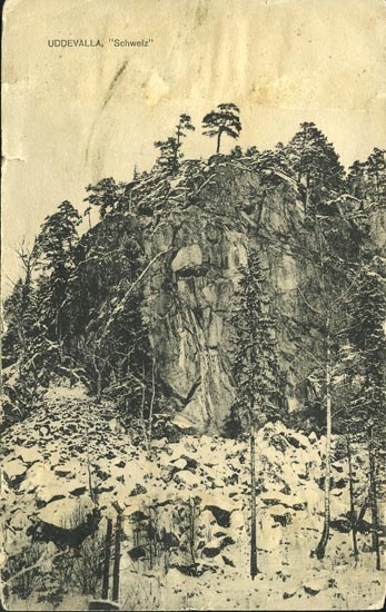 Tryckt text på vykortets framsida: "Uddevalla, Schweiz."