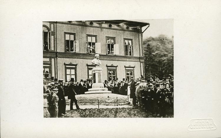 Högtidlig invigning av Anders Knape Hanssons byst den 17 juni 1879 framför gamla barnhusbyggnaden på Gustafsberg, Uddevalla