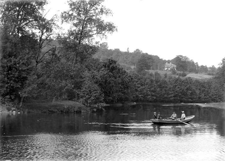 Enligt noteringar: "Fyra pojkar i roddbåt på Kvistrumsälven nedanför Kvistrumsbron.