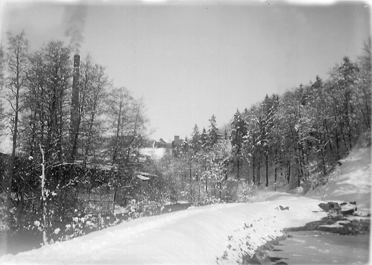 Enligt noteringar: "Munkedals bruks s.k. syradamm. Banken mellan avloppskanalen till vänster och dammen till höger är den s.k. Fattigmansvägen mellan Brukstorget och Folkets Hus." (BJ)