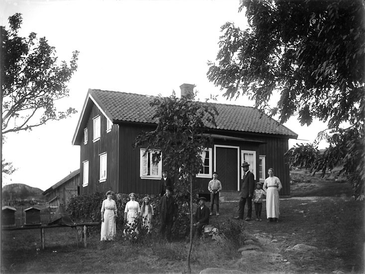 Enligt senare noteringar: "Familj utanför bostadshus på ett småbruk, någonstans i Munkedalstrakten." (BJ)