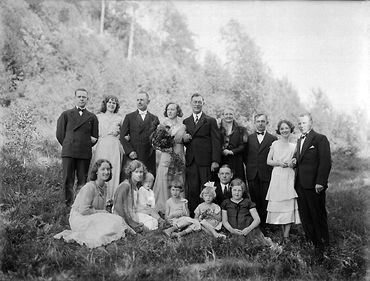 Enligt senare noteringar: "Brudpar med uppvaktning utomhus, någonstans i Foss." (BJ)
