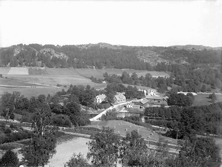Enligt noteringar: "Vy från Åtorp mot Kvistrum. Närmast Bohusbanan-Munkedals järnväg, gamla tingshuset, Kvistrums gård och Nordströms affär. Tingshuset håller på att grundläggas." (BJ)