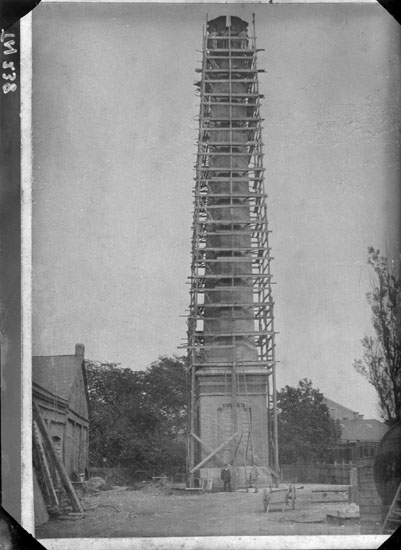 Enligt senare noteringar: "Kampenhofs fabriksskorsten, med byggnadsställningar:"