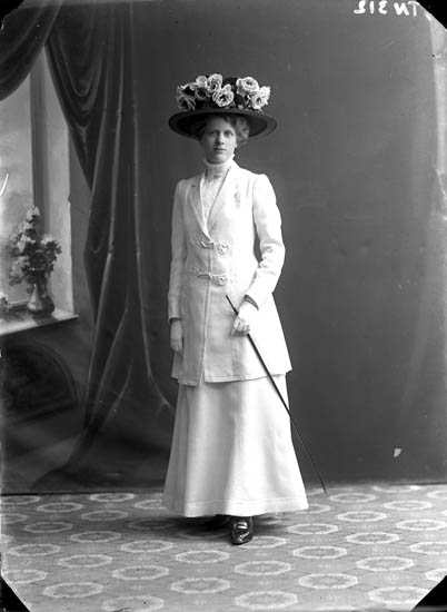 Enligt senare noteringar: "Ateljéfoto av dam, klädd i vit dräkt och stor hatt med blommor."