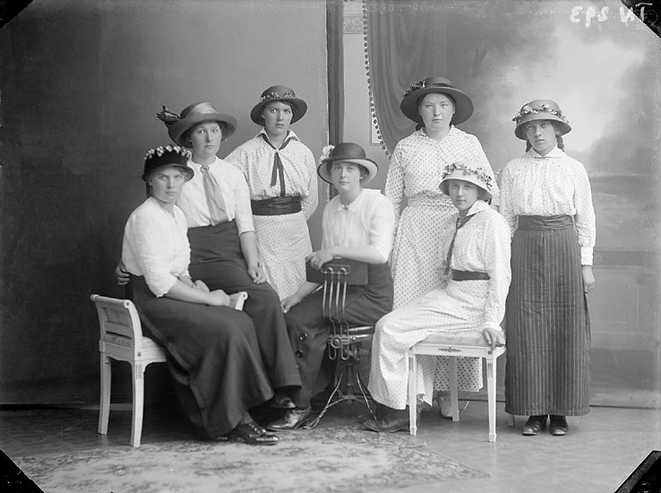 Enligt senare noteringar: "Ateljéfoto, sju unga damer med hattar, klädda i kjol och blus eller klänning."