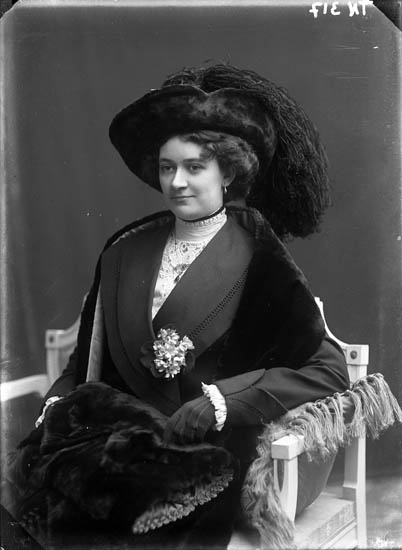 Enligt senare noteringar: "Ateljéfoto av kvinna, klädd i fin dräkt med pälsklädd hatt med plymer, boa och muff."